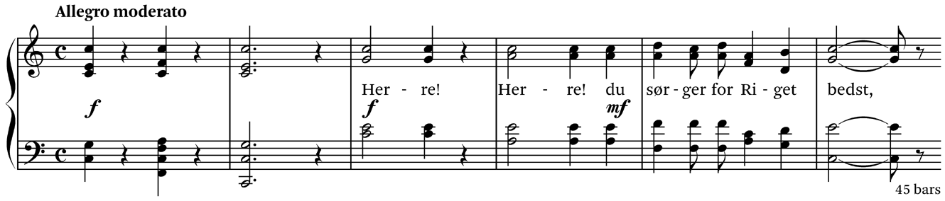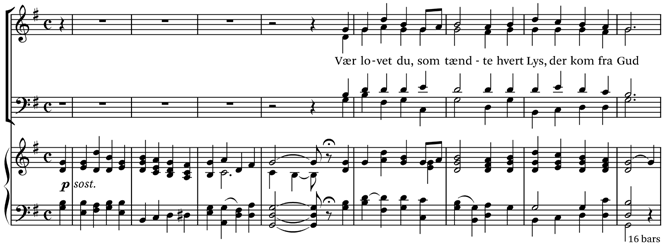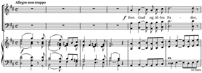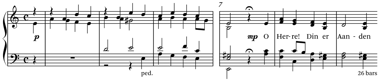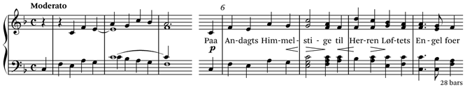 Written in brown ink. Paper: 12 staves. Above the first stave on p. 1 written in purple ink in Hartmann's hand: "Ved Bispevielser".